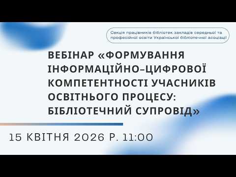 Секція працівників бібліотек закладів загальної середньої та професійної освіти Української бібліотечної асоціації 15 квітня 2026 року організувала та провела Всеукраїнський вебінар «Формування інформаційно-цифрової компетентності учасників освітнього процесу: бібліотечний супровід».